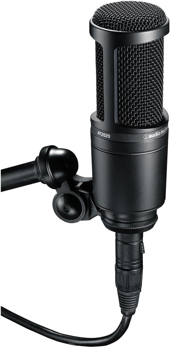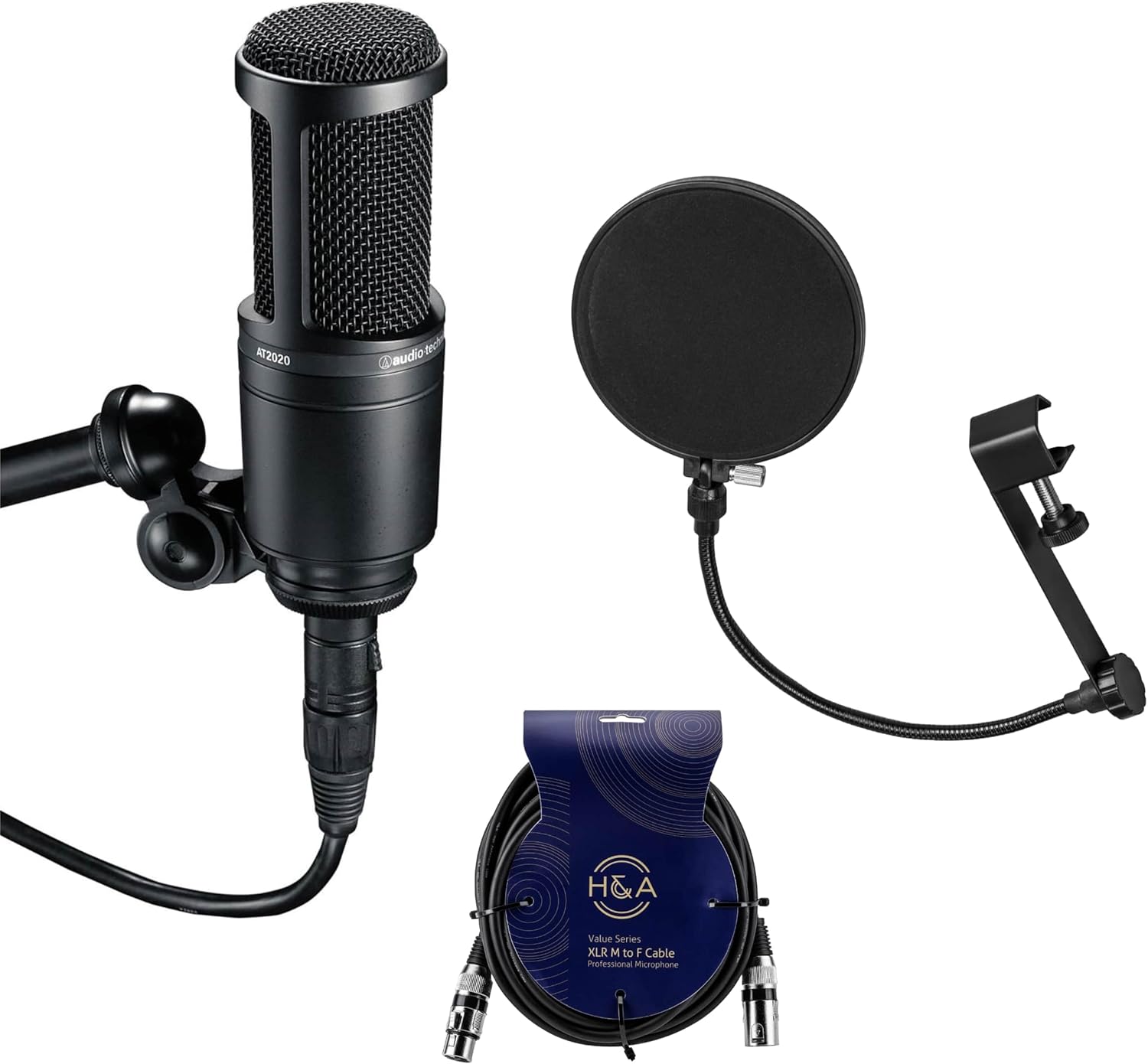 مجموعة ميكروفون ستوديو مكثف من اوديو تيكنيكا AT2020 مع فلتر بوب وكابل XLR، أبيض